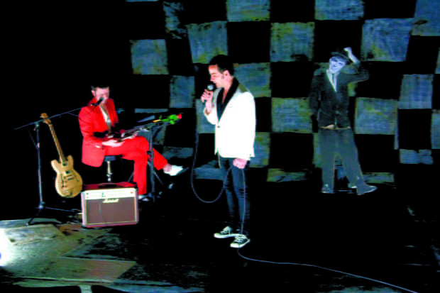 Von Fabienne Naegeli – Der Tod als Rockstar in EberhardGalati’s «I see a darkness»: Eines haben wir alle gemeinsam. Irgendwann ist Schluss. Das letzte Stündchen schlägt und das Licht geht für immer aus. Manche entschlafen sanft und friedlich, andere treten eine abenteuerliche, letzte Reise an. So auch ein Musiker, der aufgrund eines Autounfalls eine Nahtoderfahrung durchlebt. Seine Vergangenheit zieht in einer blitzlichtartigen Bilderschau an ihm vorüber, währendem er die fünf Sterbephasen, wie sie die Schweizer Ärztin und Forscherin Elisabeth Kübler-Ross definierte, durchlebt. In dieser Zwischenwelt trifft der Musiker auf den Tod in Persona, der nicht etwa in düsterer Sensenmann-Manier auftritt, sondern in einem roten Anzug mit Gitarre. Denn wenn Gott ein DJ ist, muss der Tod, damit es eine himmlisch schöne Party gibt, natürlich ein Rockstar sein. Der verunfallte Musiker kann nicht nachvollziehen, warum ausgerechnet er sterben soll. Er hat Angst davor, will es nicht wahrhaben, verweigert sich zornig dem Tod und versucht mit ihm zu verhandeln. Doch am Ende bleibt nur das Einlenken und Zustimmen. «Is a hope that somehow you, can save me from this darkness.» Auf der emotionalen Achterbahnfahrt trifft er neben dem Tod, der ihn mit Songs von Joy Division, Queen, At the Drive In, Townes van Zandt und Radiohead begleitet, immer wieder auf «The Voice» Frank S(inatra). Vom einstigen Star der Zwanziger Jahre ist allerdings nur noch eine ziemlich lädierte Pappfigur übrig geblieben, ein Abbild, das Fragmente aus seinen berühmtesten Songs wiedergibt.