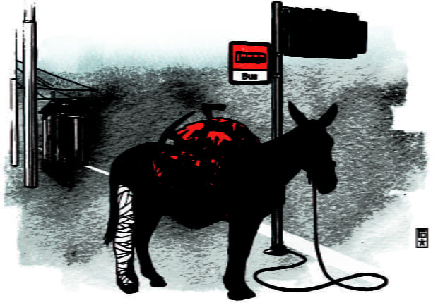 Am näch­sten Tag wurde der Ack­er wieder gepflügt. Und als sich der Abend näherte, sagte der Bauer: «Sohn, wir wur­den gestern beschimpft. Heute werde ich den Maule­sel reit­en und du kannst nebe­nan laufen.» In dieser Kon­stel­la­tion erre­icht­en die Drei das Dorf und trafen dieselbe Gruppe von Men­schen des Vortages an. Auch dieses Mal hat­ten die Men­schen etwas zu meck­ern: «Schaut her! Der kräftige Bauer lässt seinen schmächti­gen Sohn hart arbeit­en aber nicht den Maule­sel reit­en.» Der Bauer wurde grim­mig, stieg aber prompt vom Tier.