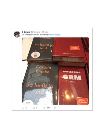 Von Dr. Regula Stämpfli - An schlechten Tagen macht die Erfindung des Internets nur für Porno und Gewalt einen Sinn. Da twittert die preisgekrönte deutsche Demokratie-Vorzeigefrau Carolin Emcke ein Bild ihres neuen Buchs, das gleichzeitig mit GRM von Sibylle Berg in irgendeinem Buchladen auf demselben Stapel liegt: „Die fühlen sich wohl zusammen.“ Lassen wir uns diesmal in unser Gehirn einbrennen. Die Philosophin Emcke schreibt über ein Buch, das sämtliche menschliche Begegnungen als Kotze, Hass, Vergewaltigung, Porno und Folter fiktionalisiert: „Die fühlen sich wohl zusammen“? Links ihr eigenes Buch abgebildet, das sich laut Pressetexten „Achtsamkeit im Miteinander“ widmet? Zwei Bücher, von denen DER TAGESSPIEGEL meint, der Untertitel „brainfuck“ sei „als Warnung“ zu lesen?