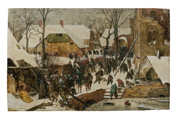 Das Bild „Die Anbetung der Heiligen Drei Könige im Schnee“ ist zwar vergleichsweise klein, doch umso eindrücklicher in seiner Aura der Originalität, der Farben, der Komposition, der Figuren ihrer bemerkenswerten Glorie gemalt. Die Tafel ist seit Jahrhunderten Teil globaler Kunstsammlungen. Der Antwerpener Handelsherr und passionierte Sammler, Peeter Stevens (1590–1668), meinte zum Tableau, es sei „ein kleines Stückchen, auf dem es schneie.“ Dann wanderte die Tafel nach Köln, wahrscheinlich bis 1695 im Besitz eines Kölner Bankiers. Doch dann beginnt das Mysterium der Reise des „Wunder im Schnee“, wie ich das Bild auch gerne nenne, da es nicht nur kürzer als die „Anbetung“ ist, sondern auch zutreffender scheint. Seiner Zeit folgend fertigte Pieter Bruegel der Ältere die Tafel für weltliche Mäzene an; Geldgeber, die seit dem 14. Jahrhundert die Kirche als wichtigsten Auftraggeber für Kunst ersetzten. Die detaillierte stoffliche Oberfläche, die kleinsten Detailbetrachtungen, die Annäherung an das bis da eher geächtete Bauernvolk übernahm der „Drol“, der etwas seltsame „Bauernbruegel“ gerne von der weltweit einzigartigen flämischen Malerei. Unverkennbar auch die Bildersprache von Hieronymus Bosch bei Breugel, dessen Maria im „Wunder im Schnee“ ziemlich grobschlächtig daherkommt.