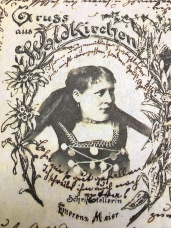 Von Dr. Reg­u­la Stämpfli — Sie sei unmöglich gewe­sen, diese Emerenz Meier, so reklamiert man noch heute im bayrischen Hin­ter­wald. Die Heimat­dich­terin aus dem Bay­erischen Wald (geboren 1874, gestor­ben 1928 in Chica­go), war zu ihrer Zeit eine Berühmtheit. Sie pack­te den harten Bauer­nall­t­ag in Poe­sie und sym­bol­isierte ab 1898 in ihrer Tra­cht die selb­st­be­wusste Frau und Intellek­tuelle auf der beliebten Ansicht­skarte „Gruss aus Wald­kirchen“. Der Erfind­er der Postkarten, Alphons Adolph him­self, sah in der klu­gen Frau vor dem Hin­ter­grund ihres Geburtshaus­es die Verkör­pe­rung von Stärke und naturver­bun­den­er Poe­sie. Wer nun meint, Emerenz Meier sei durch ihre Belieb­heit als Volks­dich­terin eine reiche Frau gewe­sen, irrt. Denn die bit­ter­ar­men „Waldler“ (Leute aus dem bay­erischen Wald­kirchen) flüchteten in Scharen nach Ameri­ka, wo sie sich ein besseres Leben erhofften. Dies tat auch die trink­feste Volkss­chreiberin Emerenz Meier. Doch Ameri­ka erwies sich als pick­el­hart. So heiratete Emerenz Meier, die sich lange gegen jede Ehe gewehrt hat­te, schliesslich sog­ar zweimal: Das erste Mal ungeliebt, das zweite Mal ganz okay. Doch nach dem Ersten Weltkrieg machte Ameri­ka das Leben ein­er deutschen Volks­dich­terin zur Hölle. Denn wer brauchte noch Gedichte in ein­er Sprache, die der Welt die Urkatas­tro­phe des 20. Jahrhun­derts einge­brockt hat­te?