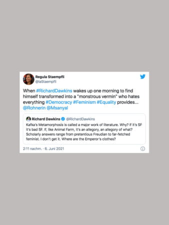 Inspiri­ert von Richard Dawkins Tweet on Sat­ur­day, 5th of June 2021: “Kafka’s Meta­mor­pho­sis is called a major work of lit­er­a­ture. Why? If it’s SF it’s bad SF. If, like Ani­mal Farm, it’s an alle­go­ry, an alle­go­ry of what? Schol­ar­ly answers range from pre­ten­tious Freudi­an to far-fetched fem­i­nist. I don’t get it. Where are the Emper­or’ s clothes?”
