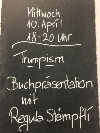Hier ein paar Zückerchen: „Falsch erzählt, ist die Demokratie schnell gekreuzigt“, „Im politischen Diskurs regiert Nihilismus bei gleichzeitig vergoldeten Innenleben“, „Kreuzdumme Biopolitik, kombiniert mit finanzpolitischen Dystopien, gefordert von Selfie-Elementarteilchen mit Smartphones.“ „Das Leben als Kreditkarte behindert die Ausübung der Demokratie.“ „Die Streuwaffe Sexismus im global verbreiteten Frauenhass wird gerne via Hyperlink markttauglich gemacht.“ „Die Kombination alte Männer-Medien-Seilschaften und junge Newcomerinnen ist als Infotainment-Combi kaum zu schlagen.“ „Trumpism ist ein System von Selbstbezogenheit, Datengläubigkeit und medialer Inszenierung.“ „Der Begriff ´Styleguide´für Branding-Strategien von Staaten stammt aus der Pornoindustrie.“ „Corporate Design gehört zu TRUMPISMUS wie der Senf zur Wurst.“„Demokratien garantieren öffentlichen Zugang zu Bildung und sind nicht dazu da, mit Steuergeldern Listenplätze auf dem fiktiven Shanghai-Rating zu vergeben.“ (Copyright Regula Stämpfli, da einige Schweizer Männer dazu neigen, mich ständig zu bestehlen… Insidergruss)