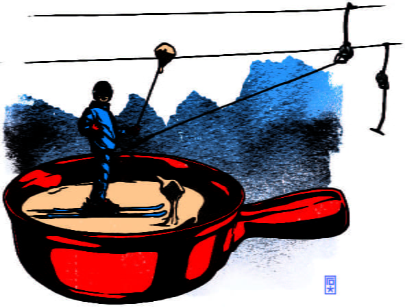 Genetik hin oder her: ich lebe nun mal in einem Land des Win­ter­sports und passe mich so gut es geht den lokalen Brauchtümern an. Aus diesem Grund ver­suche ich, die Schön­heit des Schweiz­er Win­ters und sein­er Freizeitbeschäf­ti­gun­gen zu geniessen. Am lieb­sten betreibe ich das Extreme-Fon­due­ing: Bei dieser Form des Fon­due-Essens wird die Carv­ing-Gabel im Eil­tem­po in der Käsemis­chung gedreht. Die Kun­st beste­ht darin, die Kurve so hinzukriegen, dass das Brot­stück nicht herun­ter­fällt und der Käse nicht zen­trifu­gal in der Woh­nung verteilt wird. Eine weit­ere Lieblings­beschäf­ti­gung ist das Après-Ski. Oder Après-Langlauf. Oder Après-Curl­ing. Oder Après-Schlit­ten­hun­deren­nen. Egal was, aber bitte Après.