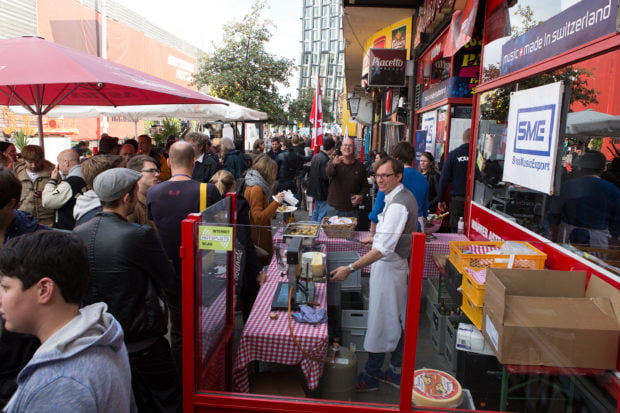 Konz­ertver­anstal­ter und zahlre­iche nationale Agen­turen für Musik luden zu Hap­pen­ings mit Essen und Trinken und meist auch etwas Musik. Die Schweiz präsen­tierte sich guthel­vetisch mit Gipfe­li und Raclette, um so dem gestärk­ten Pub­likum Exporte wie den Traum­schwiegersohn Dagob­ert und die Indie-Jungs von We Invent­ed Paris zu präsen­tieren. Die Basler Kapelle wurde danach von Ray Cokes an seine alljährliche Reeper­bahn-Revue ein­ge­laden, wo er jeden Tag seine Lieblingskün­stler des Fes­ti­vals präsen­tierte. Der Brite und das Pub­likum nah­men es mit Humor, als das Inter­view schlussendlich auf schweiz­erdeutsch geführt wurde.