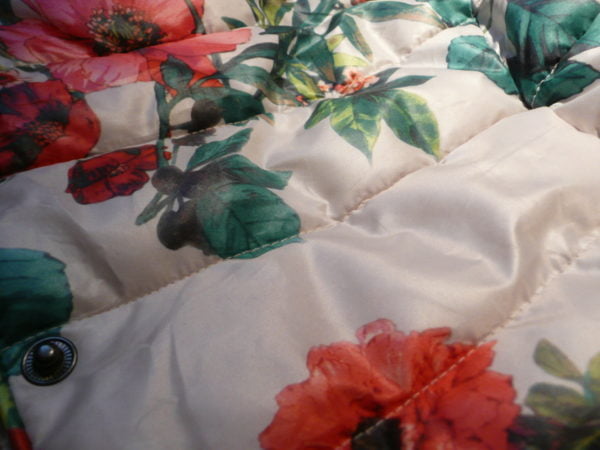 Ich habe immer gedacht, ich sei kein Daunen- und Step­p­jack­en-Typ. Bis mir auf einem Mer­ca­to im Tessin ein Mod­ell ins Auge gestochen ist, das ich haben musste. Eine Step­p­jacke bis zu den Hüften, grob hor­i­zon­tal gesteppt, perl­mut­t­far­ben­er Poly­ester, auf Schul­tern und Ärmeln ein buntes Blu­men­muster aus Mohn, Lilien, Nelken, Margeriten, Rosen, Him­beeren samt Blät­tern. Ver­schluss mit Druck­knöpfen. Klein­er Stehkra­gen wie bei den chi­ne­sis­chen Satin­klei­dern. Zwei raf­finiert ein­genähte Taschen – von aussen nicht sicht­bar. Typ Frau Anfang Dreis­sig: sel­ten in Gstaad, nicht auf der Jagd, ohne Hund, zum Glüh­weinapéro im Wald, fühlt sich wie Miche­lin auf dem Mond.