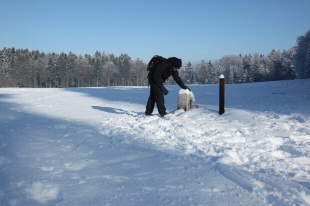 Gegen zwei Uhr starten wir auf der Ried mit dem offiziellen Teil der Route. Wir gehen entlang des südlichen Waldrands und folgen der Stadtgrenze damit so exakt wie möglich. Nach wenigen Minuten treffen wir bereits auf die erste Grenzmarkierung: Gemäss Gravur zeigt der Stein den Übergang zwischen Bern und Köniz. Ich entferne mit meinen dicken Handschuhen die Schneekappe, um der Einkerbung den genauen Grenzverlauf entnehmen zu können.