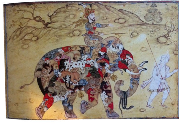 Schi­er unglaublich klingt der fol­gende koinzi­dierende Sachver­halt: Es existiert ein Album­blatt in Quer­for­mat aus der soge­nan­nten Akbar-Peri­ode (Moghul-Kaiserzeit), mut­masslich gegen 1600 ent­standen, des namhaften Miniatur­malers Abdul­lah al-Hus­sai­ni. Er ist ein Zeitgenosse Arcim­bol­dos. Die Miniatur stellt einen aus Tieren und Men­schen kom­ponierten laufend­en Ele­fan­ten mit Reit­er dar, von einem Führer weg­weisend durch eine zurück­hal­tend und annäh­ernd mono­chrom angedeutete Land­schaft geleit­et. Das Blatt ist nicht weniger skur­ril-figür­lich gestal­tet als die Porträts von Arcim­bol­do, dazu in erlesen­er Far­ben­pracht abges­timmt: Tiere und Men­schen, auss­chliesslich.